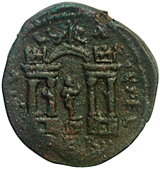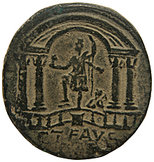 columns. Tyche has right foot on prow, and is holding a standard and a